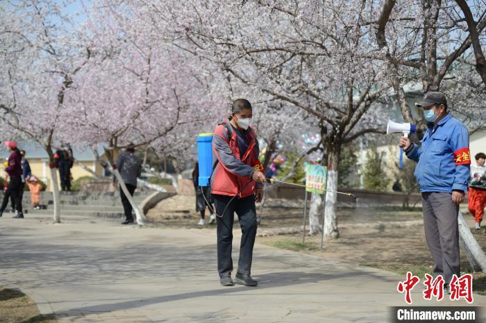 資料圖:4月7日,呼和浩特市天氣轉暖,某公園工作人員對人員密集區噴灑消毒液。(記者 劉文華)