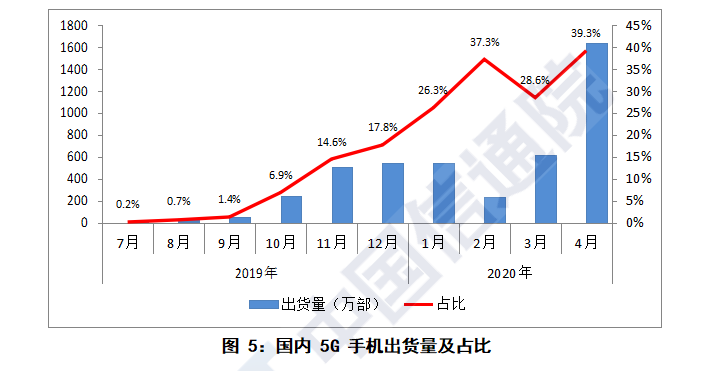 報告顯示,4月國內市場5G手機出貨量1638.2萬部,占同期手機出貨量的39.3%;上市新機型22款,占同期手機上市新機型數量的45.8%。2020年前4個月,國內市場5G手機累計出貨量3044.1萬部、上市新機型累計65款,占比分別為33.6%和47.4%。