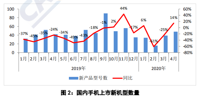 在疫情期間,各手機廠商紛紛開始利用線上直播的方式發布全新5G手機。第二季度開端,在疫情沒有正式結束之前,各廠商延續了線上發布新款旗艦的策略,數據顯示,4月國內手機上市新機型48款,同比增長14.3%。同樣受困于第一季度銷售下滑,截至4月,2020年共上市新機型累計137款,同比下降18.0%。