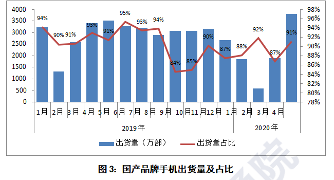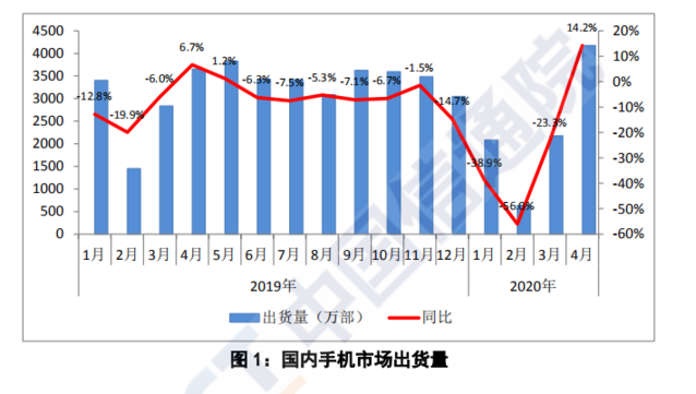 5月12日,中國信息通信研究院發布了《2020年4月國內手機市場運行分析報告》(以下簡稱報告),報告指出,2020年4月,國內手機市場總體出貨量4172.8萬部,同比增長14.2%;1-4月,國內手機市場總體出貨量累計9068.1萬部,同比下降20.1%。數據顯示,4月份疫情對手機市場的影響正在降低。