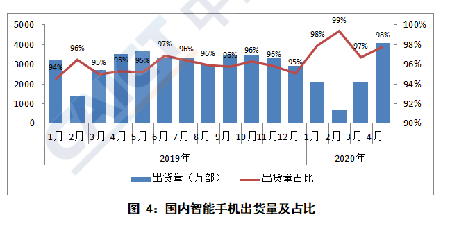 4月智能手機出貨量4078.2萬部,同比增長17.2%,占同期手機出貨量的97.7%;智能手機上市新機型32款,同比下降5.9%,占同期手機上市新機型數量的66.7%;縱觀2020年前4個月,智能手機累計出貨量8851.8萬部,同比下降17.9%,占同期手機出貨量的97.6%;智能手機上市新機型累計106款,同比下降19.7%,占同期上市新機型數量的77.4%。