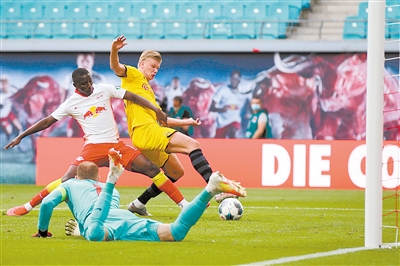 多特蒙德客場(chǎng)挑戰(zhàn)萊比錫,19歲的天才射手哈蘭德獨(dú)中兩元,幫助多特蒙德確保了聯(lián)賽亞軍。第30分鐘,雷納禁區(qū)內(nèi)接布蘭特右路傳中,直接墊給哈蘭德,后者左腳射門命中。比賽補(bǔ)時(shí)階段,布蘭特右路底線低平球傳中,哈蘭德門前搶點(diǎn)再下一城。多特蒙德2:0戰(zhàn)勝萊比錫,本賽季進(jìn)球數(shù)達(dá)到84粒,創(chuàng)造了新的隊(duì)史紀(jì)錄。