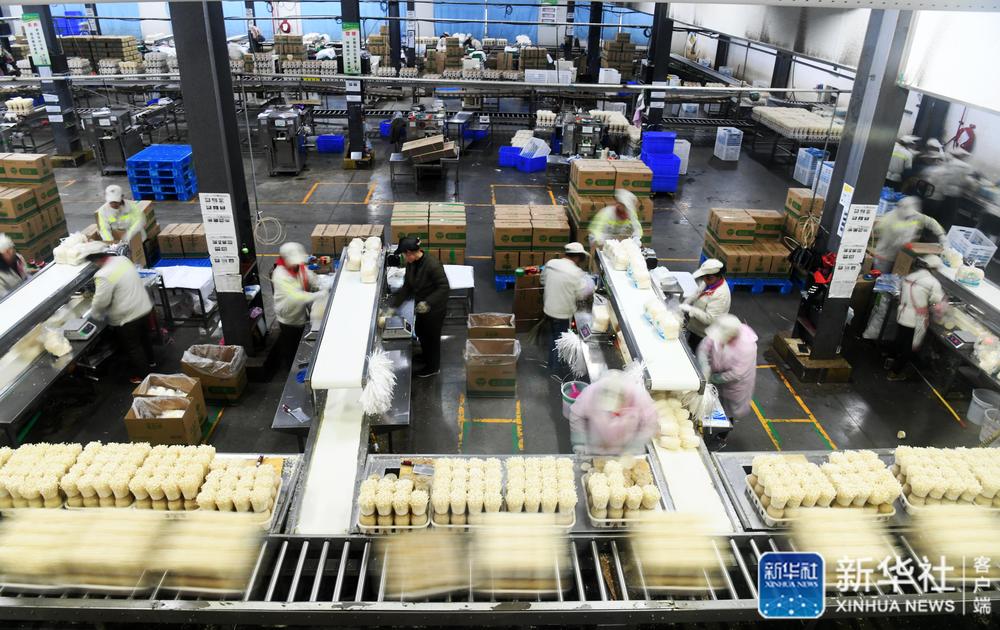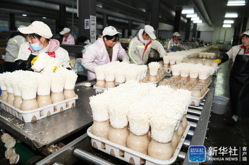 ↑工人在位于貴州威寧經(jīng)濟(jì)開發(fā)區(qū)的雪榕生物科技有限公司生產(chǎn)車間包裝金針菇(2019年10月17日攝)。新華社記者 楊文斌 攝