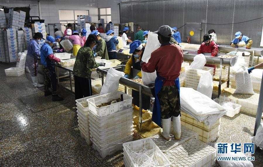 工人在山東省長島綜合試驗區北長山鄉北城村合作社辦的海鮮加工企業內對扇貝進行加工、包裝(8月10日)。 新華社記者 王凱 攝
