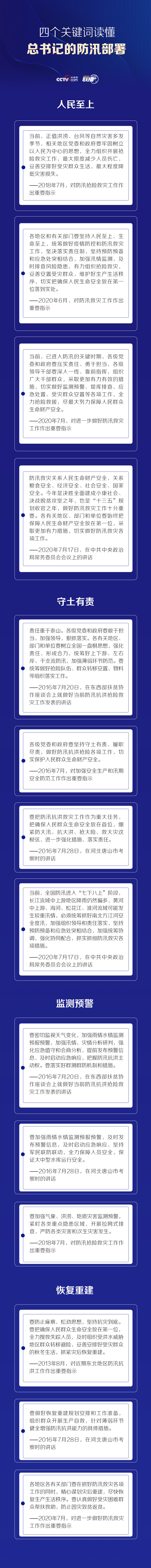 黨的十八大以來,習近平總書記曾多次對防汛救災工作作出指示、部署,始終要求“把確保人民群眾生命安全放在第一位”“各級領導干部要深入一線、靠前指揮”。央視網《聯播+》為您梳理總書記關于防汛救災工作的部署,與您一起讀懂總書記的為民情懷,增強憂患意識和責任擔當。