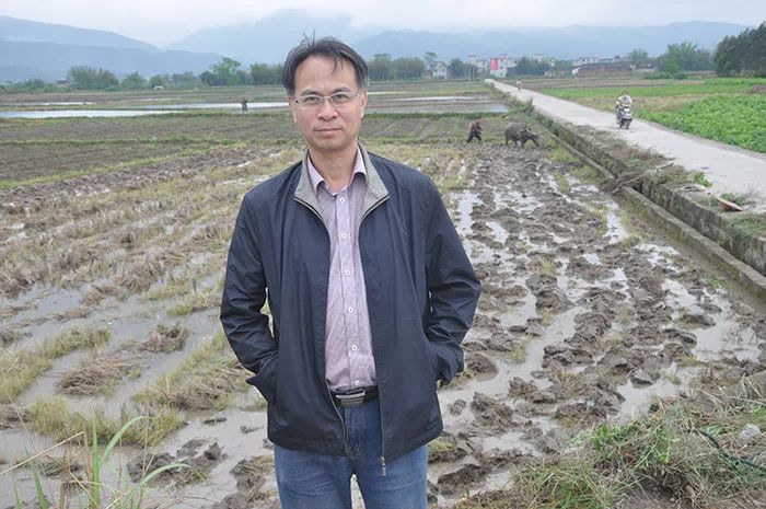 潘學(xué)標(biāo)教授在家鄉(xiāng)的稻田邊留影。(受訪者供圖)