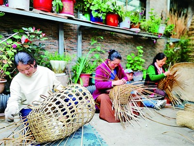 在山南市洛扎縣拉郊鄉,婦女們聚在一起編制生產和生活用竹器。光明日報記者張蕾攝/光明圖片
