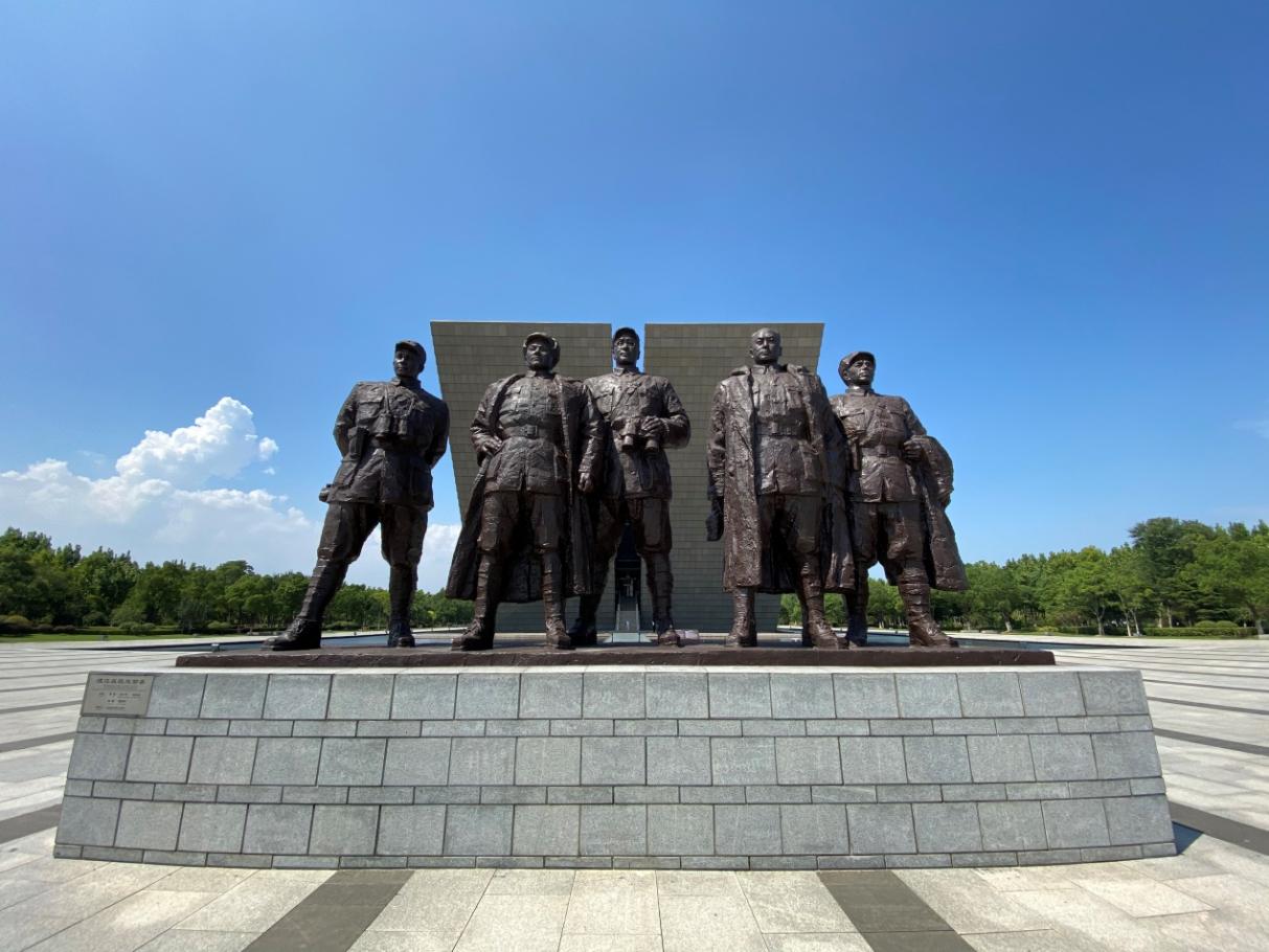 △如今,總前委銅制群雕矗立在紀念館南側。(總臺央視記者彭漢明拍攝)