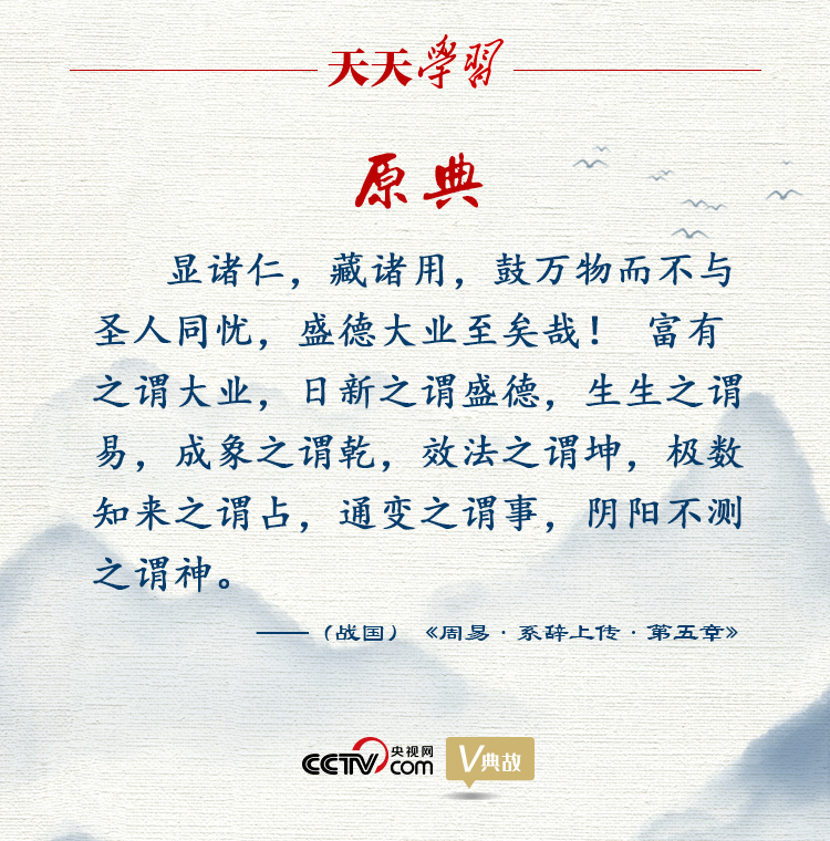 上述講話中引用的“富有之謂大業(yè),日新之謂盛德”出自《周易·系辭上傳》,意思是:廣泛創(chuàng)造物質(zhì)財富和精神財富叫做弘大功業(yè),持續(xù)永遠的日日增新叫做盛美德行。