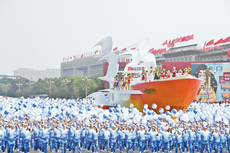 2019年10月1日上午,慶祝中華人民共和國成立70周年大會在北京天安門廣場隆重舉行。這是群眾游行中的“揚帆遠航”方陣。 新華社記者 李欣/攝