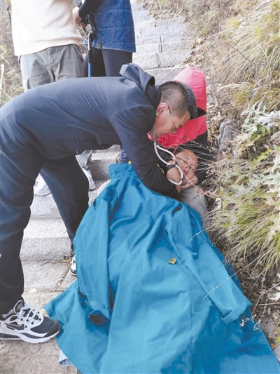 隨著時間的推移,圍上來幫忙的熱心人越來越多。一位大姐也把外套脫了下來蓋在曹先生身上,另一位大哥掏出隨身攜帶的速效救心丸給曹先生含服了8粒,還有游客主動下山前去接應醫(yī)護人員,一位廊坊來的男士稍懂些急救知識,幫曹先生檢查了脈搏并不停地安慰著李女士。