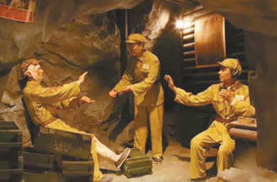 上甘嶺特功八連榮譽室用實景蠟像還原坑道內戰士傳遞蘋果的場景。