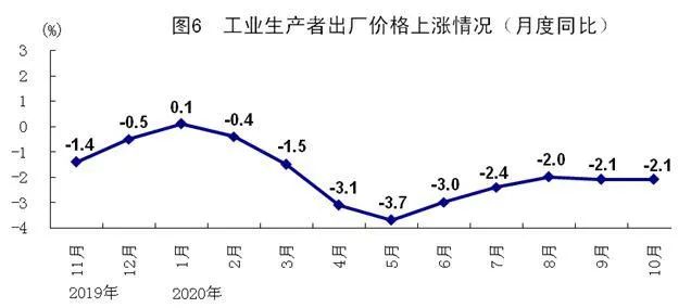10月份,全國工業(yè)生產(chǎn)者出廠價格同比下降2.1%,降幅與9月份持平;環(huán)比持平。工業(yè)生產(chǎn)者購進(jìn)價格同比下降2.4%,降幅比9月份擴(kuò)大0.1個百分點(diǎn);環(huán)比上漲0.2%。1-10月份,全國工業(yè)生產(chǎn)者出廠價格和工業(yè)生產(chǎn)者購進(jìn)價格同比分別下降2.0%、2.6%。