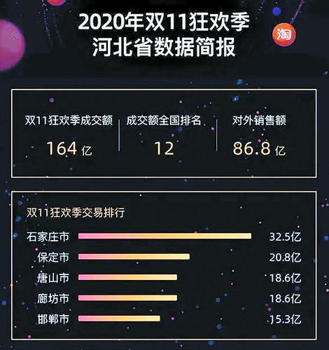 據天貓統計,截至11月11日23:59:59,中國各省購買金額增速前十榜單分別是:北京、遼寧、山西、天津、黑龍江、吉林、河北、山東、內蒙古、安徽。在河北省,“雙11”城市購買榜前五名分別是石家莊、保定、廊坊、唐山、邯鄲市。城市銷售額排行榜最強的城市是張家口,其次分別為石家莊、邢臺、保定、廊坊。河北省區縣銷售額排名前五的分別是清河縣、霸州市、石家莊市長安區、高碑店市、南宮市。
