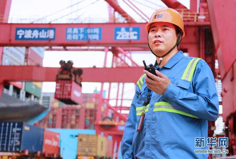 寧波舟山港北侖第三集裝箱碼頭有限公司橋吊班大班長竺士杰在寧波舟山港碼頭工作(資料照片)。新華社發