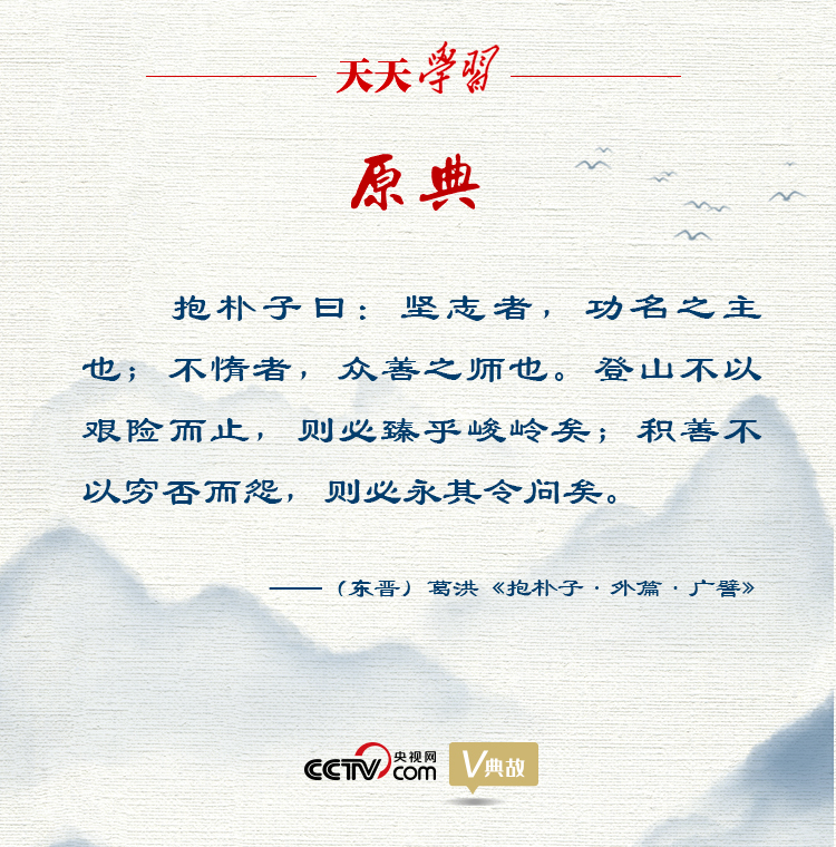 在《外篇·廣譬》中,葛洪提出:“堅志者,功名之主也;不惰者,眾善之師也。登山不以艱險而止,則必臻乎峻嶺矣;積善不以窮否而怨,則必永其令問矣。”意思是意志堅定,是建功立業的主導;勤奮不怠,是一切善行的老師。登山不因為艱難險阻而停止,就一定會到達頂峰;行善不因為自身窮困與否而埋怨,就一定會使自己的美譽長久。用登山作譬,指出意志堅定和勤奮不怠是事業成功的重要保證。