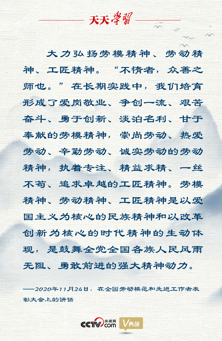 在講話中,習近平總書記還用“不惰者,眾善之師也”這句古語,深刻詮釋勞模精神、勞動精神、工匠精神的實質,指出勞模精神、勞動精神、工匠精神是以愛國主義為核心的民族精神和以改革創新為核心的時代精神的生動體現,是鼓舞全黨全國各族人民風雨無阻、勇敢前進的強大精神動力。