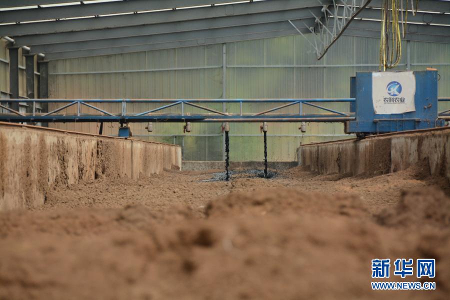 在福建省福清市永誠華多種豬公司豬場內,半自動化機械將收集的養殖糞污噴灑至墊料上。這是福建首創的“異位發酵床”技術,發酵后的糞污可以作為有機肥源,并可以讓養殖場實現污染“零排放”(2019年8月12日攝)。新華社記者 林超 攝