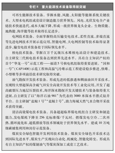 持續推進能源科技創新,能源技術水平不斷提高,技術進步成為推動能源發展動力變革的基本力量。建立完備的水電、核電、風電、太陽能發電等清潔能源裝備制造產業鏈,成功研發制造全球最大單機容量100萬千瓦水電機組,具備最大單機容量達10兆瓦的全系列風電機組制造能力,不斷刷新光伏電池轉換效率世界紀錄。建成若干應用先進三代技術的核電站,新一代核電、小型堆等多項核能利用技術取得明顯突破。油氣勘探開發技術能力持續提高,低滲原油及稠油高效開發、新一代復合化學驅等技術世界領先,頁巖油氣勘探開發技術和裝備水平大幅提升,天然氣水合物試采取得成功。發展煤炭綠色高效智能開采技術,大型煤礦采煤機械化程度達98%,掌握煤制油氣產業化技術。建成規模最大、安全可靠、全球領先的電網,供電可靠性位居世界前列。“互聯網+”智慧能源、儲能、區塊鏈、綜合能源服務等一大批能源新技術、新模式、新業態正在蓬勃興起。