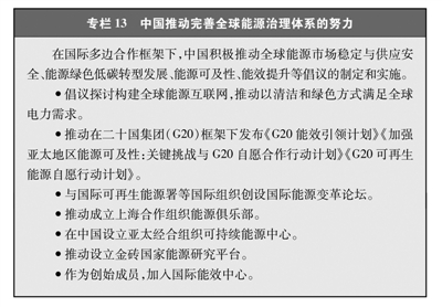 倡導區域能源合作。搭建中國與東盟、阿盟、非盟、中東歐等區域能源合作平臺,建立東亞峰會清潔能源論壇,中國推動能力建設與技術創新合作,為18個國家提供了清潔能源利用、能效等領域的培訓。(見專欄13)