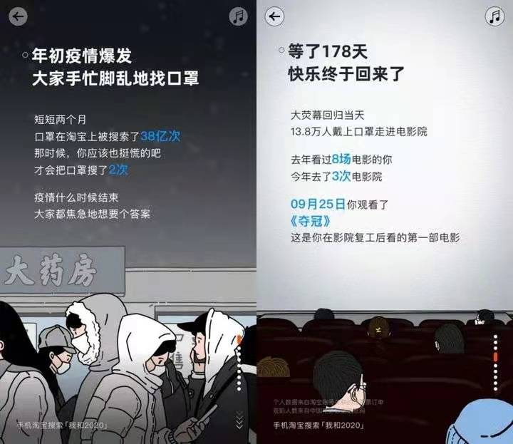 今年的賬單除了按照消費(fèi)類型分類外,還按每個(gè)月的時(shí)間維度進(jìn)行分類展示。“剁手黨”可以清晰地看到每個(gè)月自己在美食、穿搭、住房、出行、日用、教育、娛樂(lè)、運(yùn)動(dòng)等生活方面的支出比例。同時(shí),個(gè)人的消費(fèi)行為也被記錄下來(lái),如七夕禮物、好友分享、2020第一場(chǎng)電影等在淘寶2020年度記憶里一一再現(xiàn)。