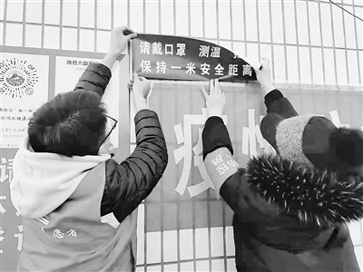 志愿者在萬家和小區(qū)門口張貼防疫注意事項。
