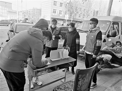 志愿者按要求對每一位進(jìn)出人員仔細(xì)地詢問、登記。