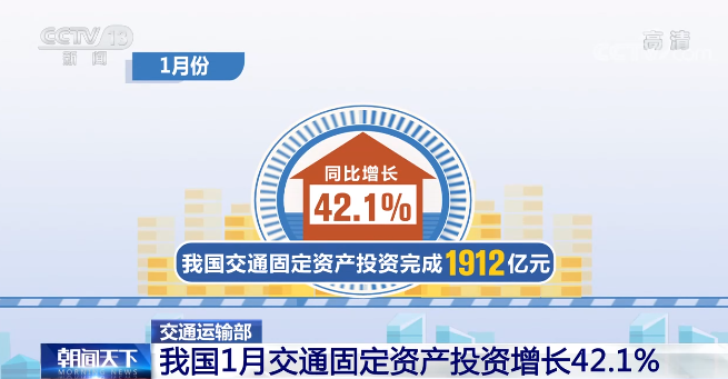 交通運輸部數據顯示,1月份,我國交通固定資產投資完成1912億元,同比增長42.1%。其中,公路水路完成投資1434億元,同比增長52.3%。