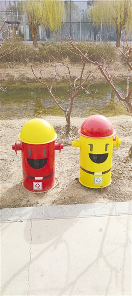 除了雕塑,119火警電話的座椅隨處可見。大紅的顏色,“119”字樣座椅腿極為吸引人的眼球。張著“大嘴巴”的垃圾桶,像一對帶著帽子的卡通消防栓,胖胖的兔子造型,也極具喜感。