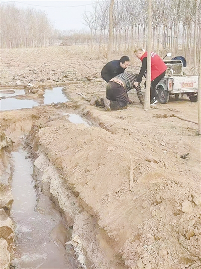 當天16時左右,楊士民、馬俊強和李策正巧春灌巡線到老人澆地的麥田附近。突然,三人聽到了一陣呼喊聲,不由得四處張望著。“聲音很微弱,我們循著聲音去看看。”楊士民這樣說。這一找,可把他們三人嚇住了,只見一名老人渾身是泥,陷在水溝中不能動彈。原來,由于老人跌落的地方處在麥田附近一米多深的水溝,地勢低矮,很難被人發現。