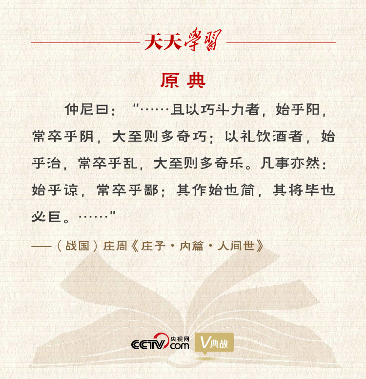 “其作始也簡(jiǎn),其將畢也必巨”見于《莊子?人間世》第二節(jié)。講的是楚王派葉公子高出使北方強(qiáng)國(guó)齊國(guó),葉公子高感到責(zé)任非常重大,臨行前便向孔子來求教。孔子教導(dǎo)葉公子高,消除了他出使前的憂懼心理。莊子將孔子塑造成道家的代言人,假借孔子之口,談父子之親、君臣之義。