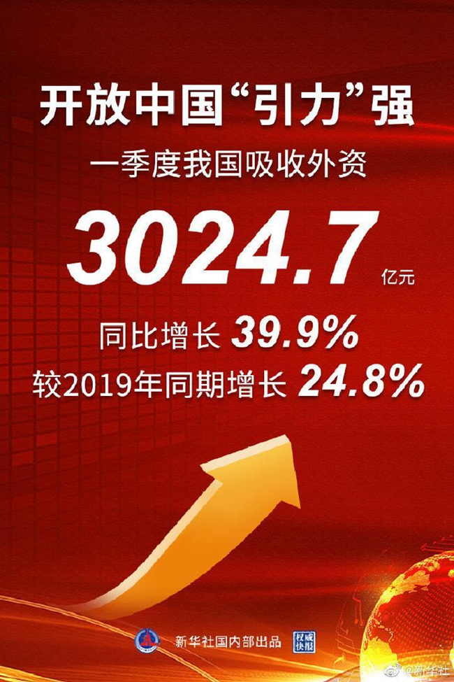 商務部15日發布數據顯示,一季度,我國新設外商投資企業10263家,同比增長47.8%;實際使用外資金額3024.7億元,同比增長39.9%。