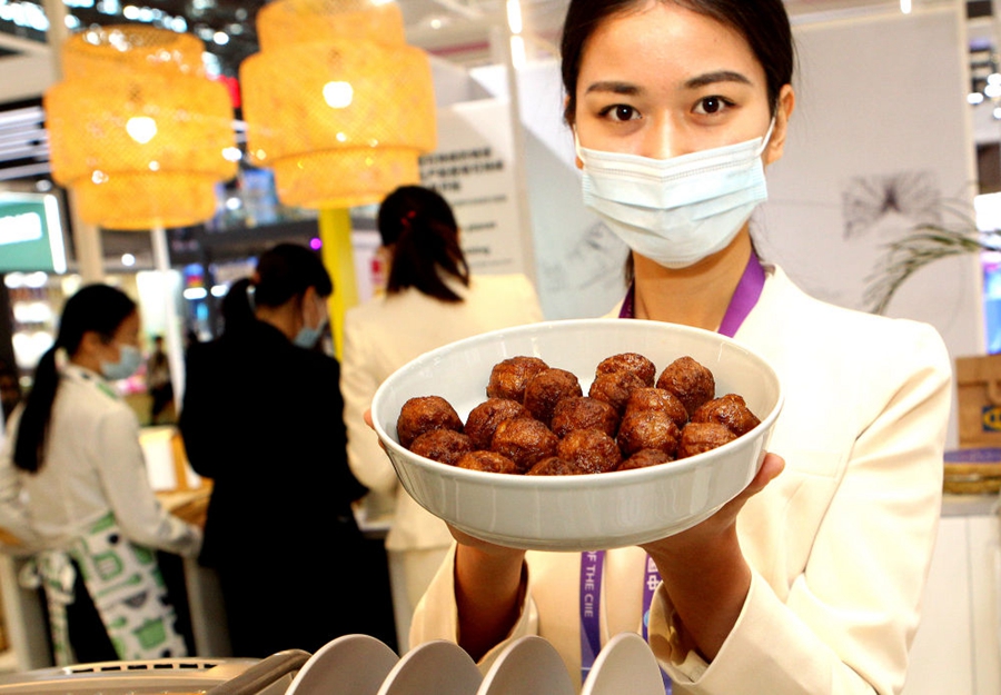 工作人員在第三屆進博會展臺展示剛出爐的植物蛋白肉丸。新華社記者 陳飛 攝