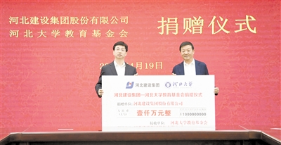 本報訊 4月19日,河北建設集團股份有限公司向河北大學教育基金會捐款1000萬元,推動河北省高等教育事業發展,獻禮河北大學百年華誕。