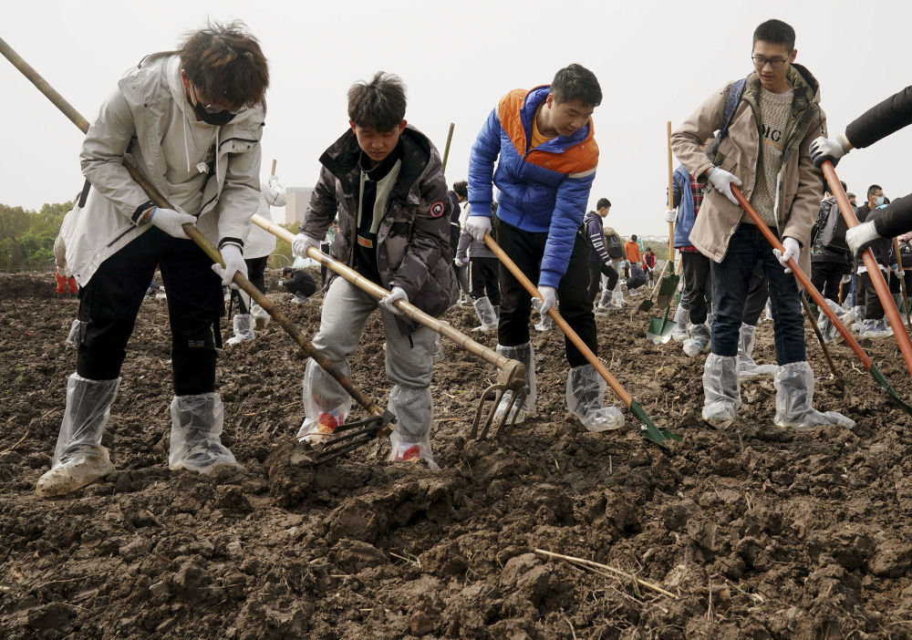↑2021年3月21日,在上海交通大學新農科勞動教育課上,學生們在平整土地。