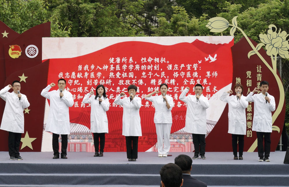 ↑2020年5月4日,北京大學援鄂醫療隊代表在北大五四青春詩會上宣誓。