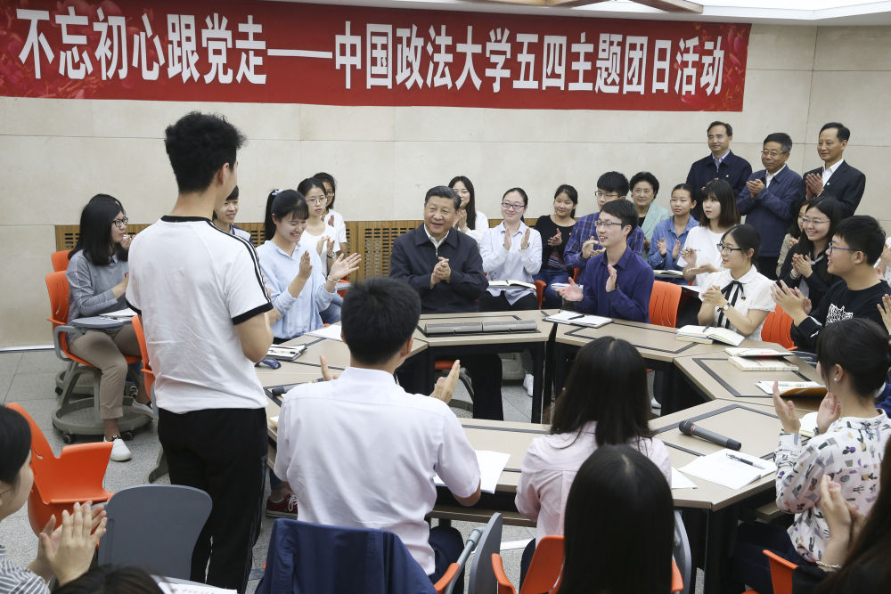 ↑2017年5月3日,習近平在中國政法大學學生活動中心參加民商經濟法學院本科二年級2班團支部開展的“不忘初心跟黨走”主題團日活動。