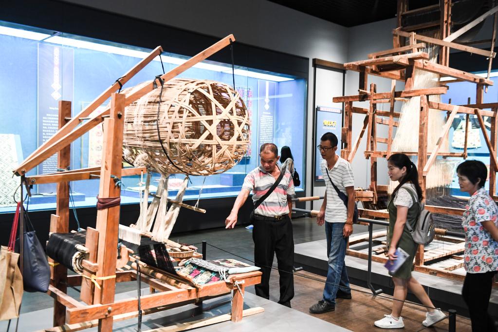 參觀者在廣西民族博物館里參觀壯族織錦機(2019年10月4日)。新華社記者 曹祎銘 攝