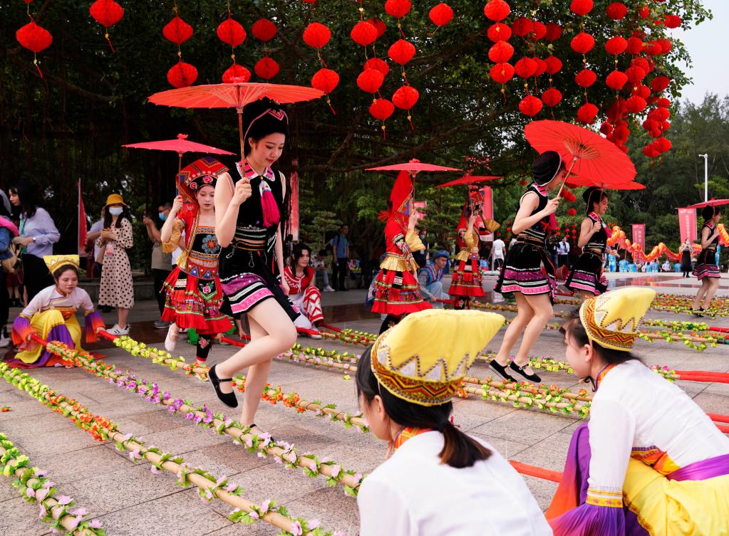 在“壯族三月三·八桂嘉年華”主會場,身著民族服飾的演員在跳竹竿舞(4月14日)。新華社記者楊馳 攝