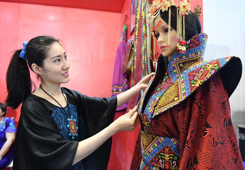 在廣西南寧國際會展中心,“90后”“壯錦女孩”范麗華整理作品《錦衣華服》壯錦嫁衣準備展出(2018年5月19日)。新華社記者陸波岸 攝