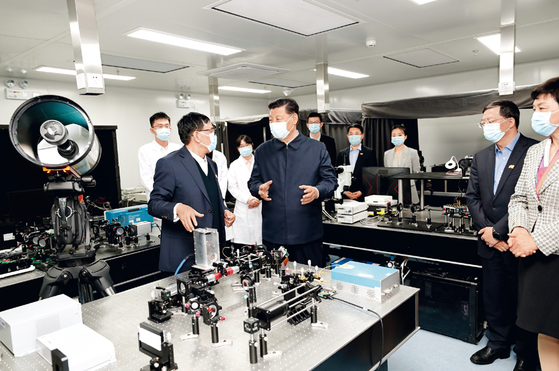 2021年4月19日,在清華大學建校110周年校慶日即將來臨之際,中共中央總書記、國家主席、中央軍委主席習近平來到清華大學考察。這是習近平在清華大學成像與智能技術實驗室同師生們親切交談。 新華社記者 黃敬文/攝