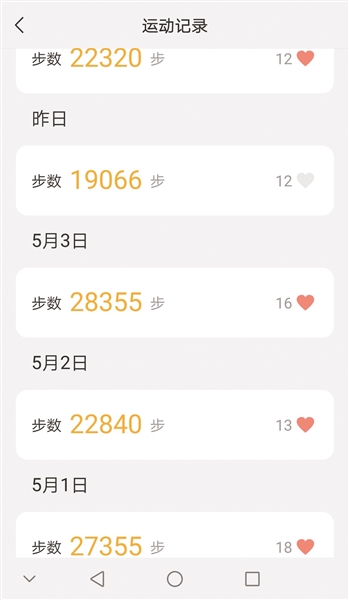 在趙敬東的“今日運動”步數統計中,5月1日當天共計27355步,5月2日22840步,5月3日28355步,5月4日19066步,5月5日22320步。5天的假期,趙敬東在環衛保潔的道路上走了約12萬步。而在趙敬東看來,這個“五一”假期的工作量比平時還少了不少。“假期街上的人多車多,沖洗的時候都要停下來避讓行人,肯定比平時的沖洗慢了許多,步數也會少。”