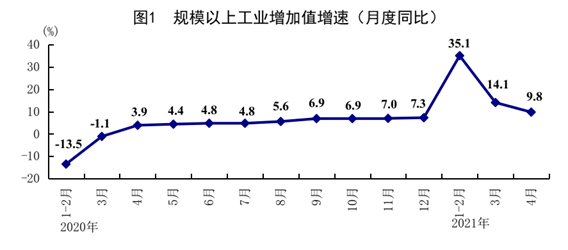 4月份,全國規模以上工業增加值同比增長9.8%;兩年平均增長6.8%,比3月份加快0.6個百分點;環比增長0.52%。分三大門類看,采礦業增加值同比增長3.2%,兩年平均增長1.7%;制造業同比增長10.3%,兩年平均增長7.6%;電力、熱力、燃氣及水生產和供應業同比增長10.3%,兩年平均增長5.1%。裝備制造業和高技術制造業增加值同比分別增長13.1%、12.7%,兩年平均分別增長11.2%、11.6%。分產品產量看,新能源汽車、工業機器人、集成電路、微型計算機設備同比分別增長175.9%、43.0%、29.4%、13.5%,兩年平均增速均超過19%。分經濟類型看,國有控股企業增加值同比增長8.6%;股份制企業同比增長10.4%,外商及港澳臺商投資企業同比增長8.4%;私營企業同比增長11.2%。1-4月份,全國規模以上工業增加值同比增長20.3%,兩年平均增長7.0%。4月份,中國制造業采購經理指數為51.1%,連續14個月高于臨界點;企業生產經營活動預期指數為58.3%。