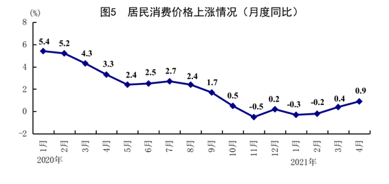 4月份,全國居民消費價格同比上漲0.9%,漲幅比3月份擴大0.5個百分點;環比下降0.3%。分類別看,食品煙酒價格同比上漲0.1%,衣著上漲0.2%,居住上漲0.4%,生活用品及服務上漲0.4%,交通通信上漲4.9%,教育文化娛樂上漲1.3%,醫療保健上漲0.1%,其他用品及服務下降1.3%。在食品煙酒價格中,豬肉下降21.4%,鮮菜下降1.3%,糧食上漲1.1%,鮮果上漲2.7%。扣除食品和能源價格后的核心CPI上漲0.7%,漲幅比3月份擴大0.4個百分點。1-4月份,全國居民消費價格同比上漲0.2%。