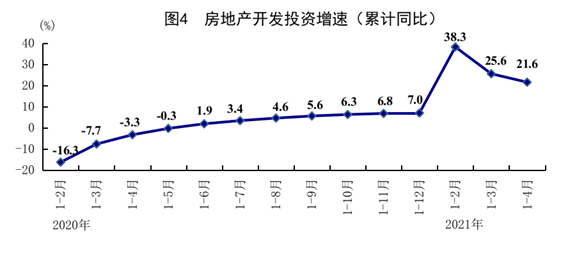 1-4月份,全國固定資產投資(不含農戶)143804億元,同比增長19.9%,兩年平均增長3.9%;4月份環比增長1.49%。分領域看,1-4月份基礎設施投資同比增長18.4%,兩年平均增長2.4%;制造業投資同比增長23.8%,兩年平均下降0.4%;房地產開發投資同比增長21.6%,兩年平均增長8.4%。全國商品房銷售面積50305萬平方米,同比增長48.1%,兩年平均增長9.3%;商品房銷售額53609億元,同比增長68.2%,兩年平均增長17.0%。分產業看,第一產業投資同比增長35.5%,兩年平均增長15.2%;第二產業投資同比增長21.7%,兩年平均增長0.8%;第三產業投資同比增長18.7%,兩年平均增長5.0%。民間投資同比增長21.0%,兩年平均增長2.9%。高技術產業投資同比增長28.8%,兩年平均增長11.8%;其中高技術制造業和高技術服務業投資同比分別增長34.2%、18.1%,兩年平均分別增長13.7%、7.8%。高技術制造業中,醫療儀器設備及儀器儀表制造業、醫藥制造業投資同比分別增長40.3%、33.1%,兩年平均分別增長13.4%、13.8%;高技術服務業中,檢驗檢測服務業、電子商務服務業投資同比分別增長46.1%、39.1%,兩年平均分別增長17.6%、32.2%。社會領域投資同比增長26.3%,兩年平均增長10.6%;其中衛生、教育投資同比分別增長46.5%、22.1%,兩年平均分別增長23.9%、12.1%。