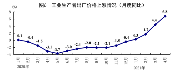 4月份,全國工業生產者出廠價格同比上漲6.8%,漲幅比3月份擴大2.4個百分點;環比上漲0.9%。從主要行業看,石油和天然氣開采業、黑色金屬礦采選業、黑色金屬冶煉和壓延加工業、有色金屬冶煉和壓延加工業同比分別上漲85.8%、38.3%、30.0%、26.9%;計算機、通信和其他電子設備制造業,汽車制造業同比分別下降1.4%、0.8%。工業生產者購進價格同比上漲9.0%,漲幅比3月份擴大3.8個百分點;環比上漲1.3%。1-4月份,全國工業生產者出廠價格和工業生產者購進價格同比分別上漲3.3%和4.3%。
