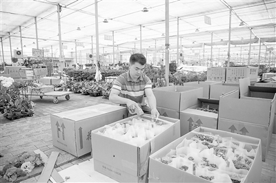園區正成為美麗經濟平臺,這是工作人員在為花卉打包準備外發。