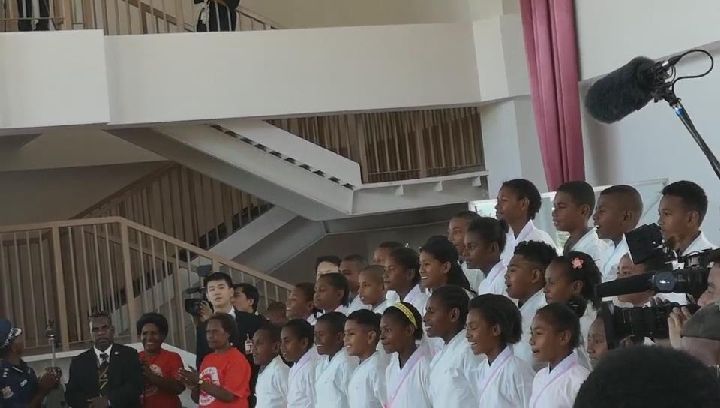 30名身著中式服裝的巴新學生組成了小合唱團,用中文演唱了中國民歌《茉莉花》。習近平主席駐足欣賞。演唱結束時,他走上前去,同前排的孩子們握手問候。