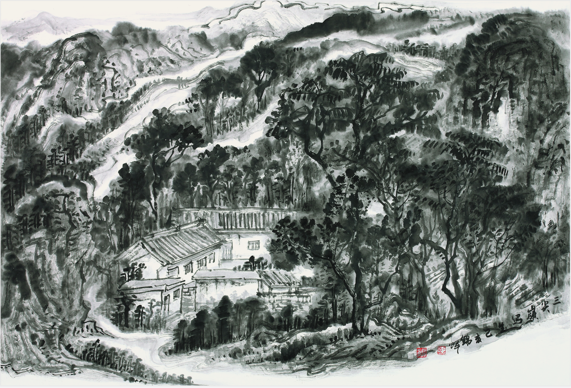 中國的山水畫更多地是關注人與自然的相融之道,彭錦輝重視寫生意趣與筆墨語言在畫面中的呈現,用筆能緊能松,用墨可收可放,較為自如地處理畫面中筆墨形色間的平衡。她尊重自然物象,注重深入自然體悟寫生之意趣,在實踐中不斷思索傳統山水審美與當代視覺經驗的矛盾化解。面對當下文化語境和學術課題,彭錦輝深入研究山水畫的學術文脈與藝術經典,在表現時代特征和弘揚水墨精神的基礎之上,執著于山水畫的布局造境、筆墨營造方面的深耕細作。在創作中彭錦輝以書寫性用筆入畫,將山水畫與書法的筆墨語言融匯一體,通過其獨具特色的筆墨語言,一方面通過對傳統山水的解構創作出新的山水結構樣貌,另一方面將對山川的飽滿情緒抒發于筆端之下,二者結合,可以看出她有意識地將山水畫的核心價值與當代文化情懷相結合,進一步拓展著山水畫的內涵和外延。