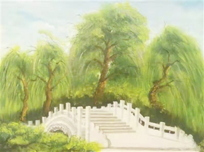 2020年疫情暴發后,離畫室最近的競秀公園成為廖明德老師固定的采風地點。從那時起,廊亭一角古色古香、小橋流水韻味十足、楊柳飄拂春色滿園……公園里的各種景致被他捕捉并創作成畫,每一幅畫都仿佛讓人身臨其境。廖明德作畫速度不快,“猜他畫的是什么”成了圍觀市民的一大樂趣。
